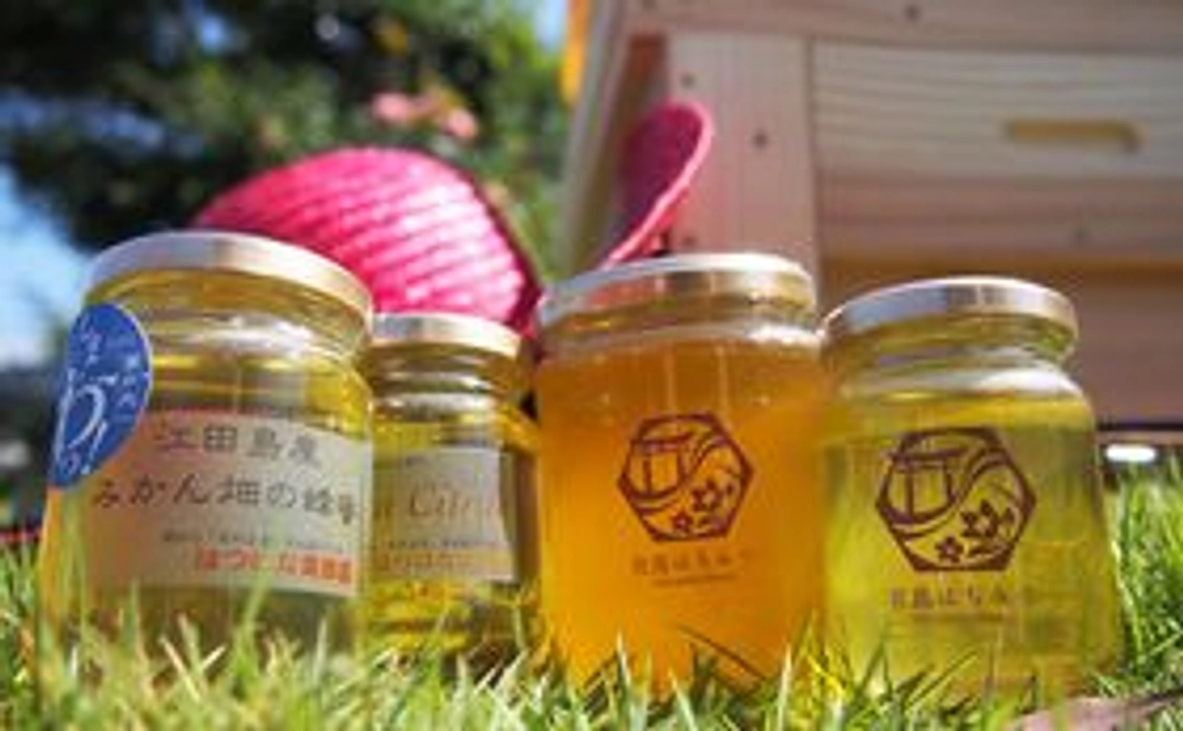 来年の収穫期である5月〜9月の5ヶ月の間に、120g/月をお届けします。写真は左から宮島で採取したハチミツ300g/120g、江田島で採取した温州みかんのハチミツ120g、愛媛県で採取した晩柑のハチミツ120gです。