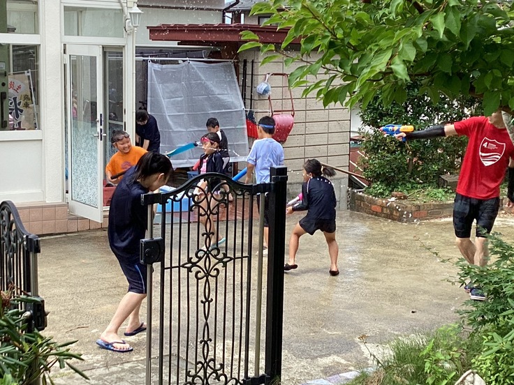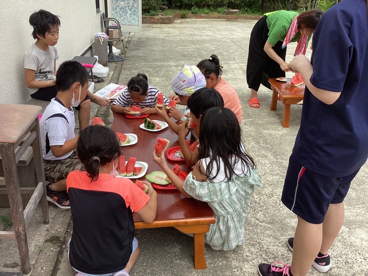 写真を撮っていたタブレットが熱くなるほど、厳しい暑さでしたが、子どもたちはとっても楽しい時間を過ごしました。スイカも冷たくて甘くて最高です。