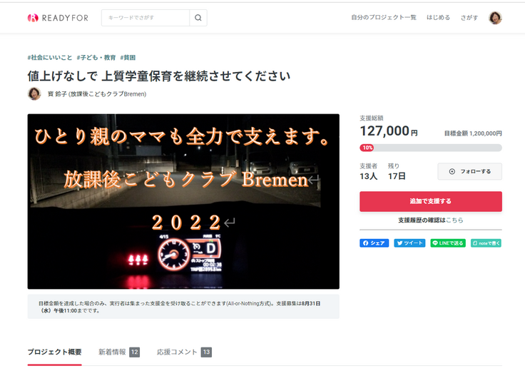 あと17日ですのに、まだ目標額の10%にも満たなかったので、FBでシェアをお願いいたしました。