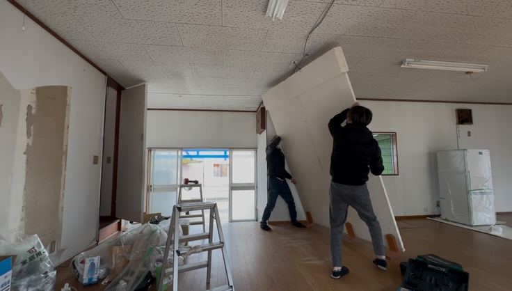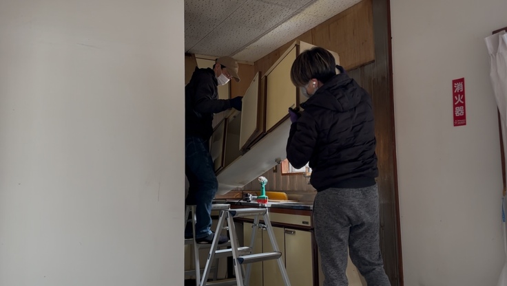 不要な間仕切り、ボロボロのキッチンの解体作業に天井、壁の塗装に備えた養生も少し...