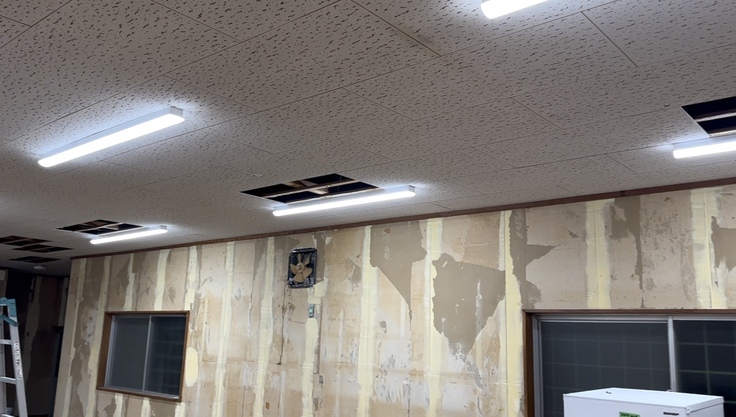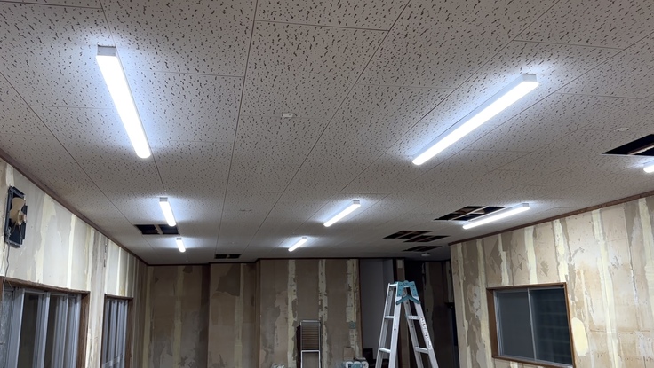 LEDベースライトも全体に付き、壁の裏紙も1階フロアは剥がし終了✨