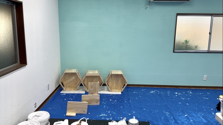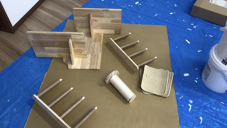 壁は塗り終え、猫ちゃん達の遊び道具が続々と届いている状況です!