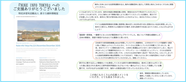 2024年10月7日から11月22日に実施いたしましたクラウドファンディングプロジェクト 『原発に頼らない社会を。市民から世界へ37年の情報発信を継続したい』 に、たくさんの温かいご支援をお寄せいただきまして誠にありがとうございました。2024年度の『Nuke Info Tokyo』活動報告書をお届けいたします。