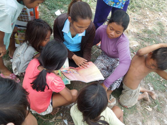 (読み書きができない大人も、彼女の読む本に聞き入ります。)