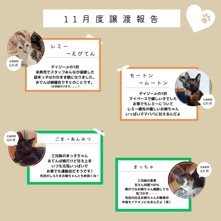 今月は 4匹の猫たちが新しい家族のもとへ旅立ちました! 🐈