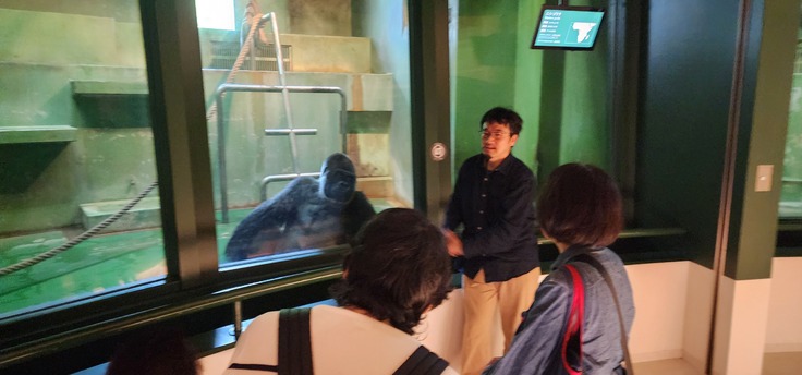木彫りを実施する前に、ゴリラの体の観察を行いスケッチしました。屋内展示場にモンタが居てくれたので、かなり近い距離で観察をすることができました。そんな様子が珍しく映ったのか、モンタも私たちのことを観察しているようでした。