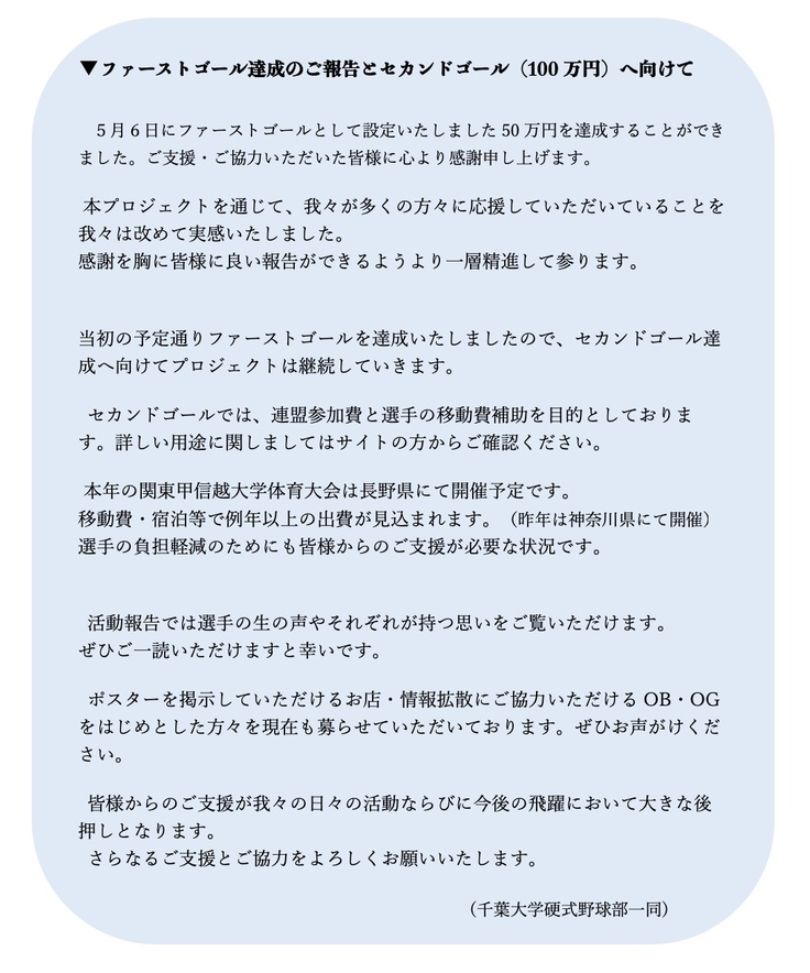 これらの目標達成により、千葉大学硬式野球部はより良い練習環境を整え、選手たちの成長と競技力向上を促進することが期待されます。皆様のご支援とご協力をよろしくお願いいたします。