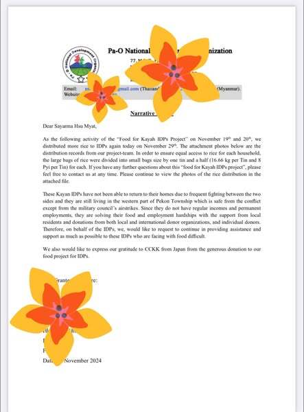 まもなく2024年が終わろうしています。あと1ヶ月でクーデータからまる4年となりますが、未だに戦闘が続き、避難民が続出し、国民の暮らしはますます苦しい状況に陥っています。
