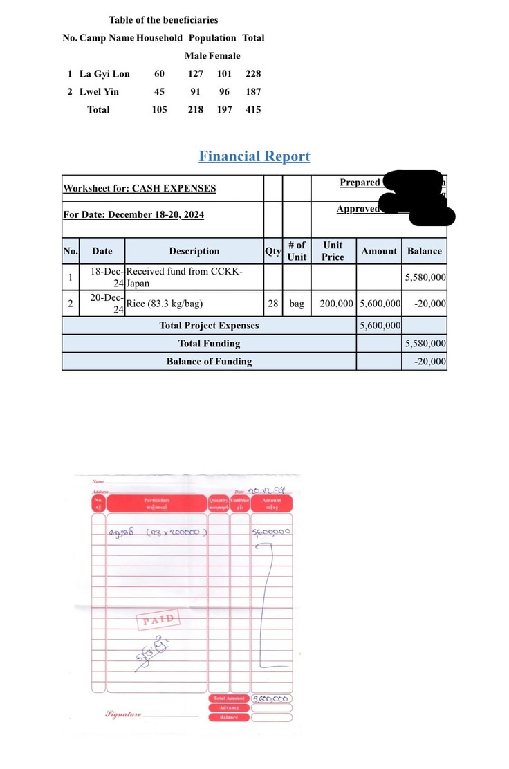 また11月は、10月に引き続き、同じシャン州の避難キャンプへの第二弾としてのお米の支援を行いました。支援額は20万円、1,064kgのお米(38kg入りの袋を28袋)を届けることができました。さらに、マグェ管区での子供たちへの食糧と教育支援にも10万円使わせていただきました。11月も、シャン州とマグェ管区合わせて、30万円の支援となります。是非、最後の写真までご覧いただけましたら幸いです。