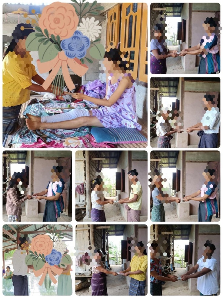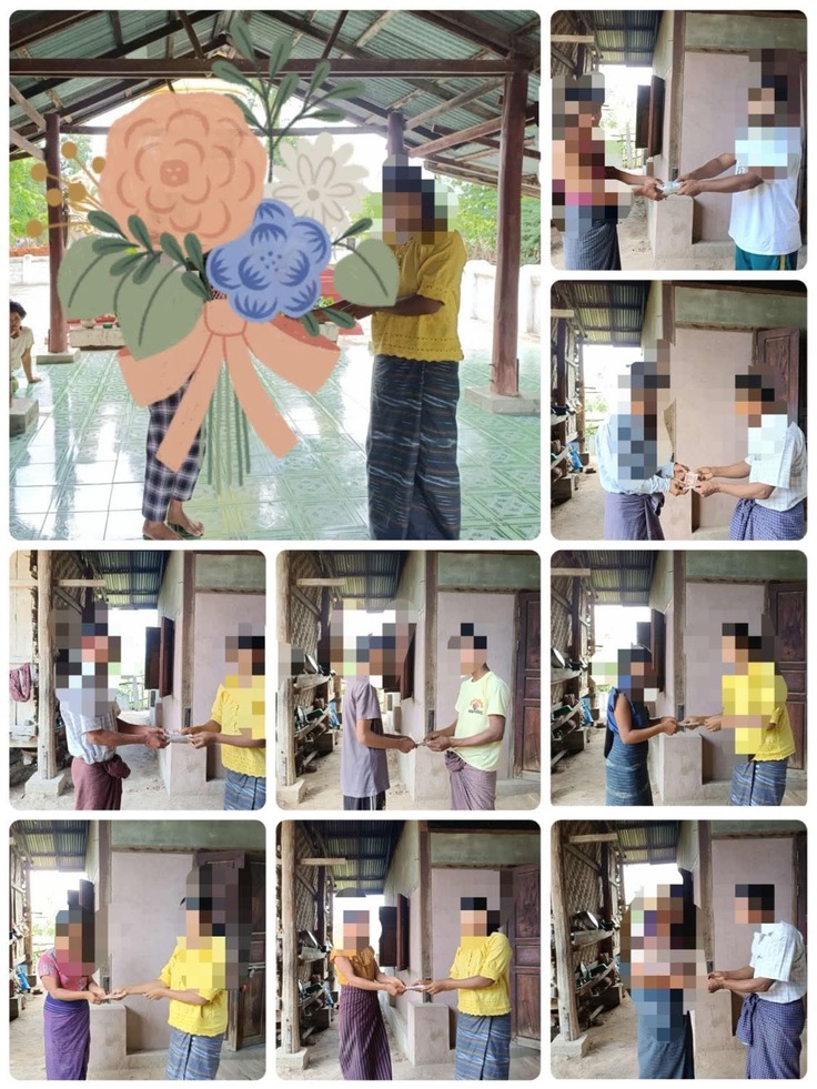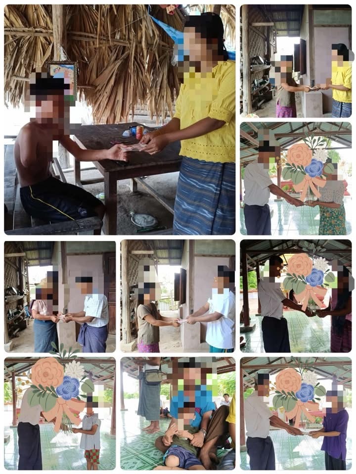 本日は、ザガイン管区で空爆された学校の児童らのご遺族と重症者(計64家族)に対し支援をしましたのでご報告です。空爆で亡くなられた児童24名のご遺族に対し一家族につき300,000MMK(1万円相当)、重症者44名のご家族に対し一家族につき275,000MMK(9,167円相当)現金を寄付しました。支援総額は、60万円です。