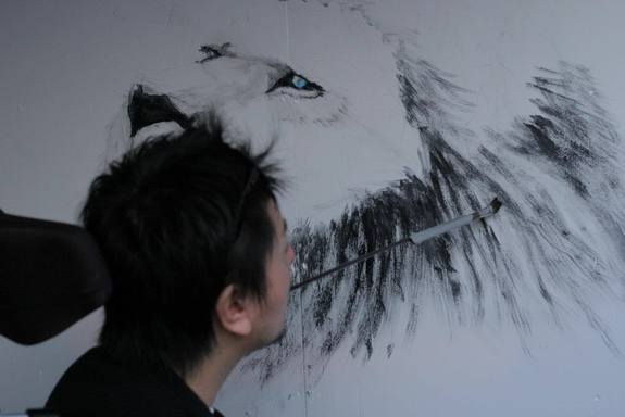 そう、彼の作品は口に加えた筆、棒を加えて操作するパソコンから生まれているのです。