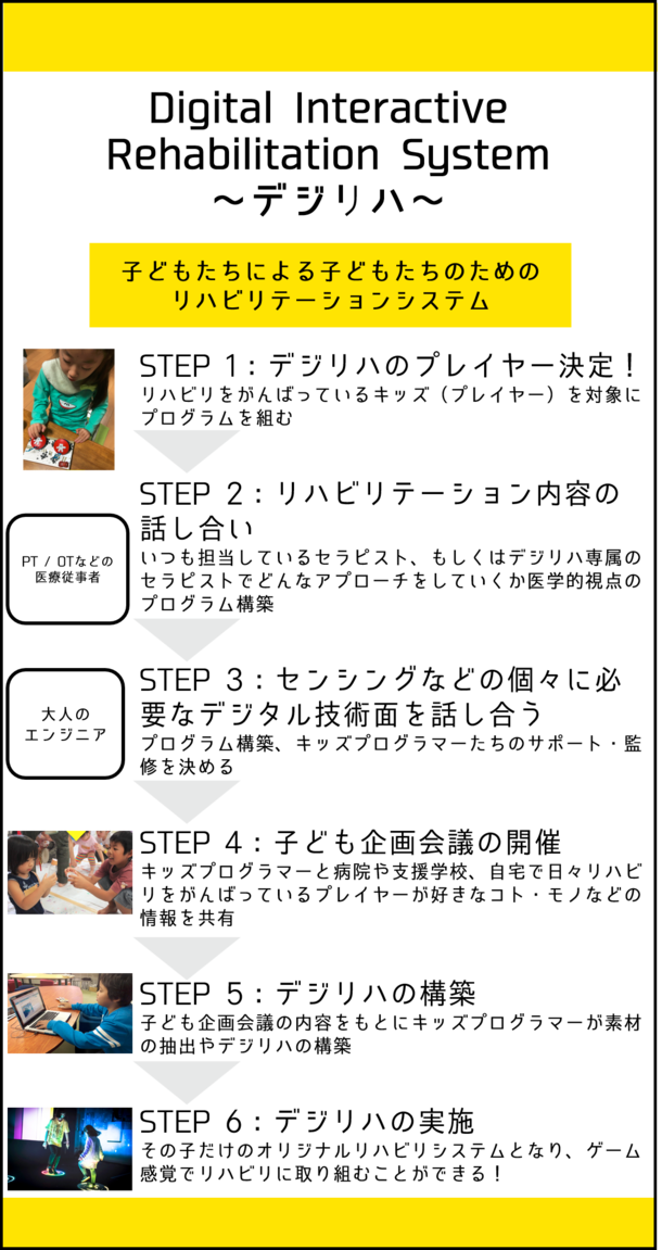 そこで、デジリハは病児・障がい児などのリハビリを必要とする子どもたち(以下、プレイヤー)とプログラミング教室に通う子どもたち(以下、キッズプログラマーを『デジタルアート』で繋げる試みをします。