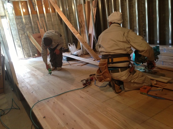 そして、水道工事、電気工事、ガス工事が入って、現在、フローリングを貼っています。