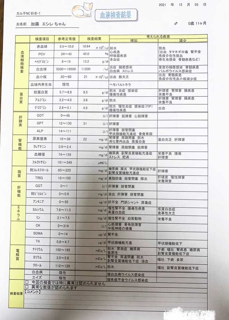 前回より貧血やグロブリンの数値が少し増えていたり、