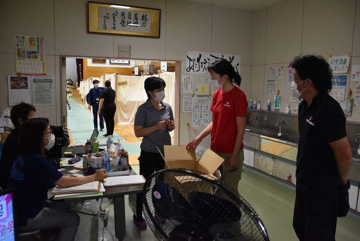物資のニーズは日々変わります。被災状況や地域、個々の事情によっても異なります。今回の水害の場合、Civic Forceは発災から数日は避難所設営前後に必要な物資としてマスク、非接触型体温計、消毒液といった感染対策グッズをはじめ、着の身着のまま逃れてきた人々の下着、タオル、寝具などを届けました。また、道路の復旧が進み、ボランティアの受け入れが始まると、ブルーシートやバケツ、水分補給の飲料など泥等の片付け作業に必要な物資を提供。避難所では、風通しをよくするために窓を開けており、蚊取り線香など思いも寄らないニーズがあがってくることもあります。7月後半に入った現在は、暑さ対策として、扇風機の貸与なども行っています。