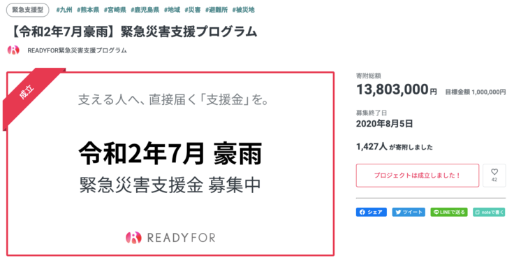 2020年7月6日〜2020年8月5日までご支援を受け付けておりました、【令和2年7月豪雨】緊急災害支援プログラムの支援募集が無事に終わりましたことをご報告させていただきます。