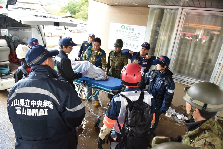 PWJは発災の翌日である10月13日朝から医師、看護師、災害救助犬を含むレスキューチームをヘリコプターや車両などで長野市に派遣しました。長野市の浸水地域にある病院のうち、停電した長野2つの病院からDMATなどと連携して約240名の患者を他の医療施設に緊急搬送しました。