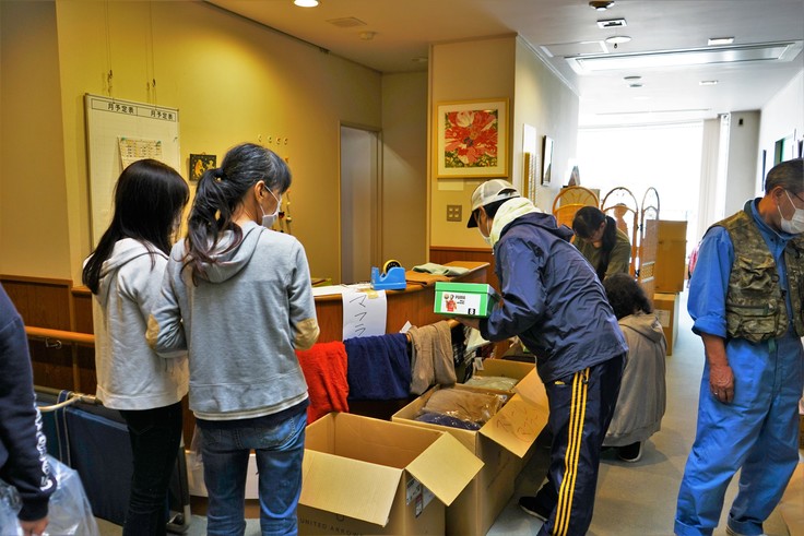 その後、本格的な避難所の調査を行いました。避難所では肌着、衣類、タオルなどのニーズがあり、特に夜間は冷え込む季節に入ったため、防寒着が必要という声もありました。企業から提供を受けたものを中心に、肌着、防寒着、靴下などを順次、避難所に届けました。
