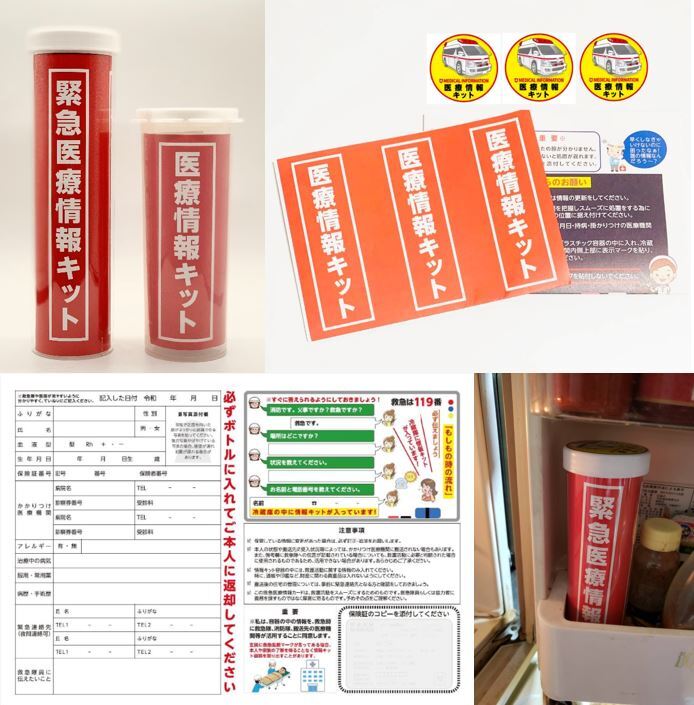 救急医療情報キットとは、「緊急時にかけつけた救急隊等が、かかりつけの医療機関や緊急連絡先等の情報を素早く正確に把握し、適切な救急活動ができるよう、あらかじめ自分の医療情報を容器に入れて冷蔵庫に保管しておく」ためのものです。