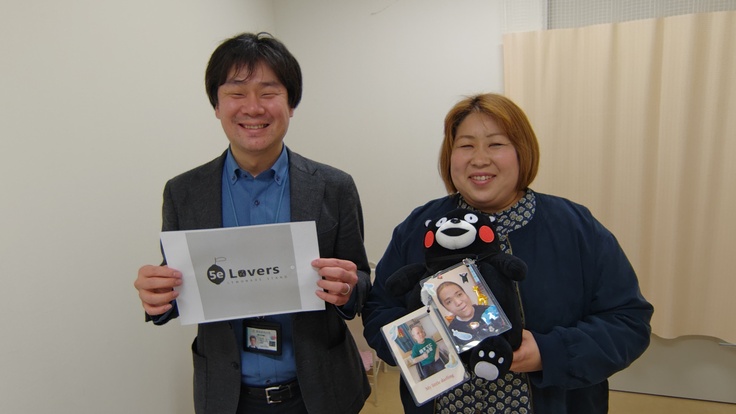 おもちゃ寄付の訪問時に、5e Lovers代表の山本様、しゅんちゃん、くまモンと一緒に記念写真。