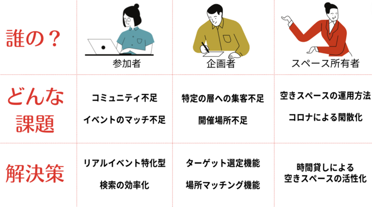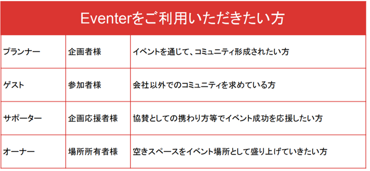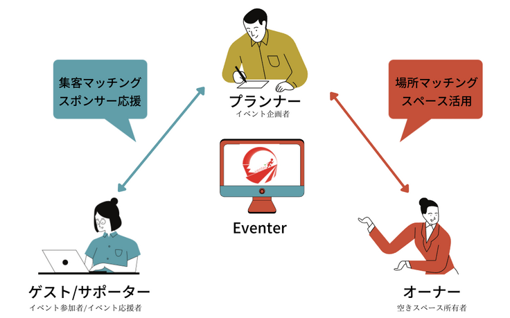 Eventerは、『参加者』、『企画者』、『スペース所有者』の3つの立場がお互いwin-winな関係になる"リアルイベント応援プラットフォーム"になります。