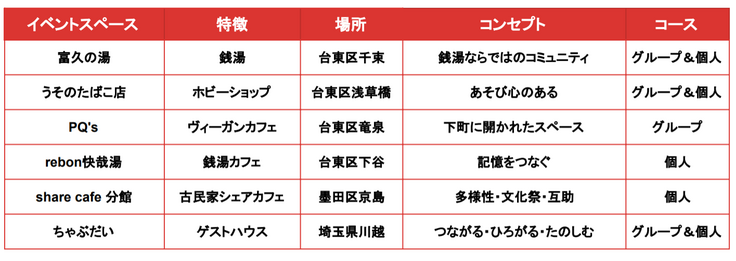 ※イベント企画は、リターン前に各スペースのホームページをご確認頂き、スペースの既存コミュニティ&過去イベントを参考にお考え下さい。