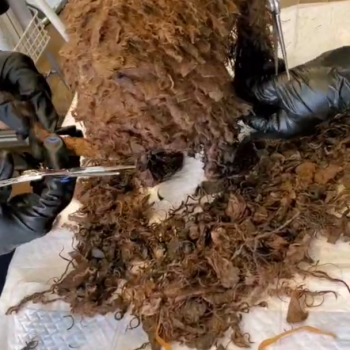 バリカンでは歯が立たなく、それを地道にハサミでチョキチョキ
