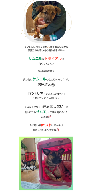 サムエル君の病気の事も理解し迎え入れ、そしてこの譲渡をきっかけに保護犬・犬の保護活動への取材を始めるようになったそうです。