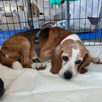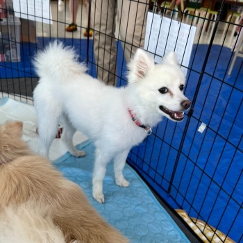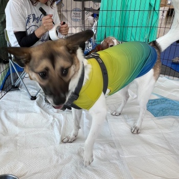 毛が飛び散らない様に来ている服(室内開催なので)に貼る名札待ちの子に、既にお客さんに愛想を振りまいている子
