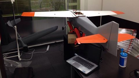 今日は事務所で制御装置など、器材のセットアップを行いました。屋外では小さく見えますが…会議室に入れるとギリギリでした。翼幅、胴体長はそれぞれ2mあります。