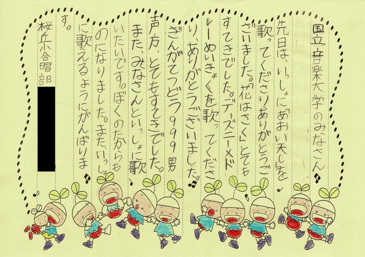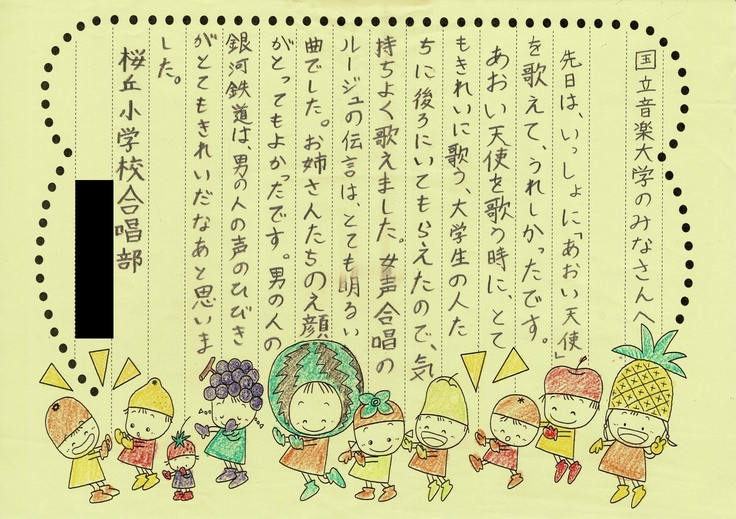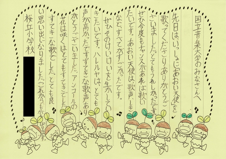 まずは、一緒に共演してくれた相馬市立桜丘小学校合唱部の児童さんの感想を抜粋でお届けします(小学生のとても丁寧に心を込めて綺麗に書いてくださった感想にとても感動です!)。