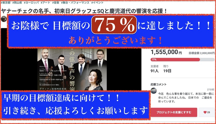 ここ3日間、達成率が伸び悩み、昨日は全く動きが無かったので、ドキドキでしたが、お陰様で目標額の3/4、75%に達することが出来ました。