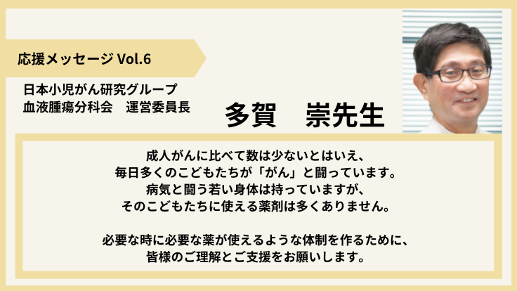 日本小児がん研究グループ血液腫瘍分科会 運営委員長の多賀先生より、本プロジェクトへの応援メッセージをお寄せいただきましたので、ご紹介いたします。