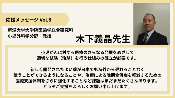 新潟大学大学院医歯学総合研究科小児外科学分野 木下義晶先生より、本プロジェクトへの応援メッセージをお寄せいただきましたので、ご紹介いたします。
