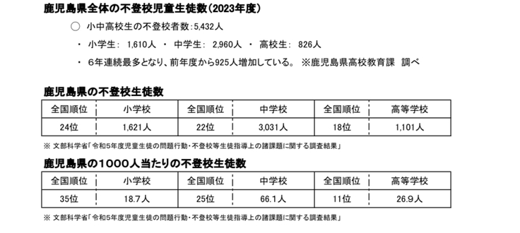 鹿児島県では、学校に行きづらさを抱える小中高校生が5,432人(2023年度)にのぼり、6年連続で過去最多を更新しています。