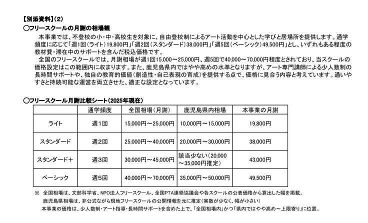 当スクールでは週1回19,800円、週5回49,500円と、全国のフリースクール相場(週5回40,000〜70,000円)の範囲内。鹿児島県内ではやや高めですが、アート専門講師による少人数制・長時間サポートを含む内容で、価格に合った価値を提供します。