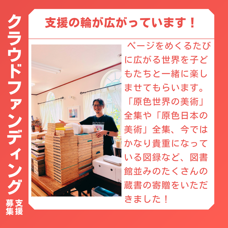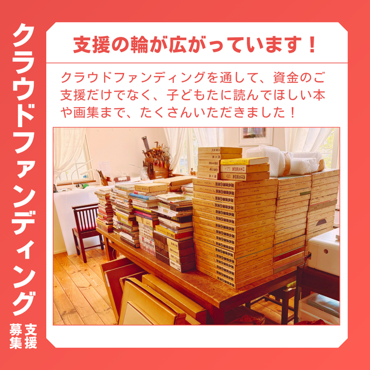 クラウドファンディングを通して、資金のご支援だけでなく、子どもたちに読んでほしい本や画集まで、たくさんいただきました!