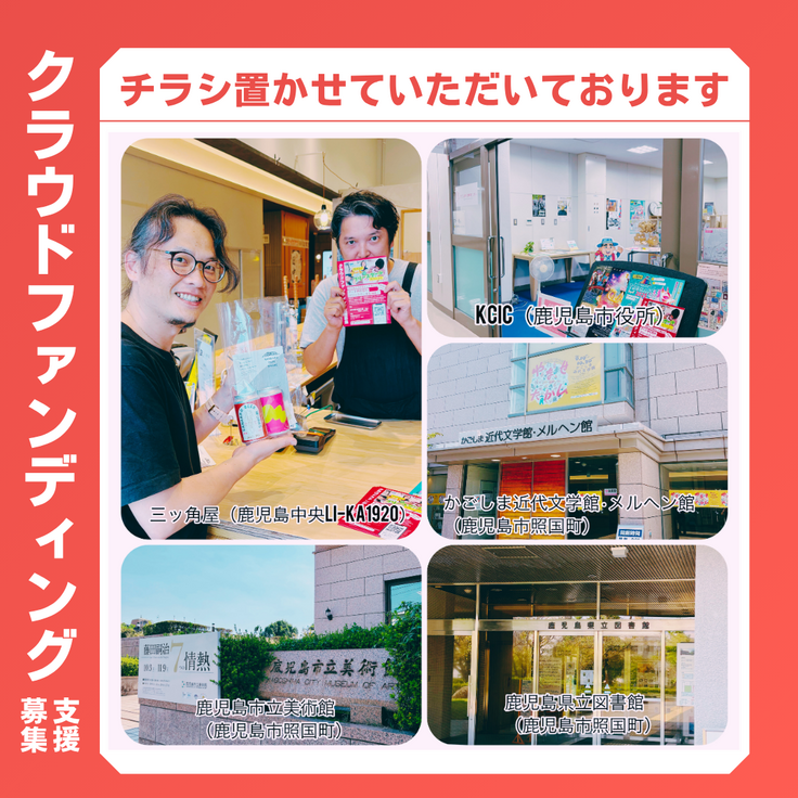 クラウドファンディング支援募集のチラシを、鹿児島市内を中心に多くの施設・店舗に置かせていただいております。