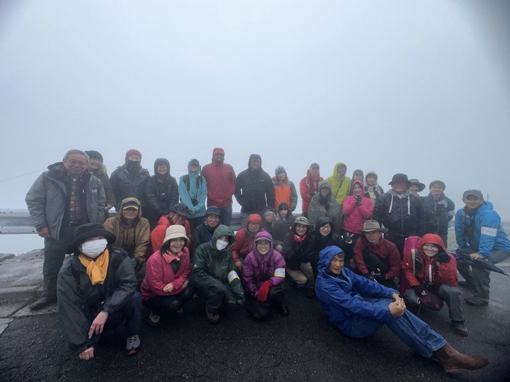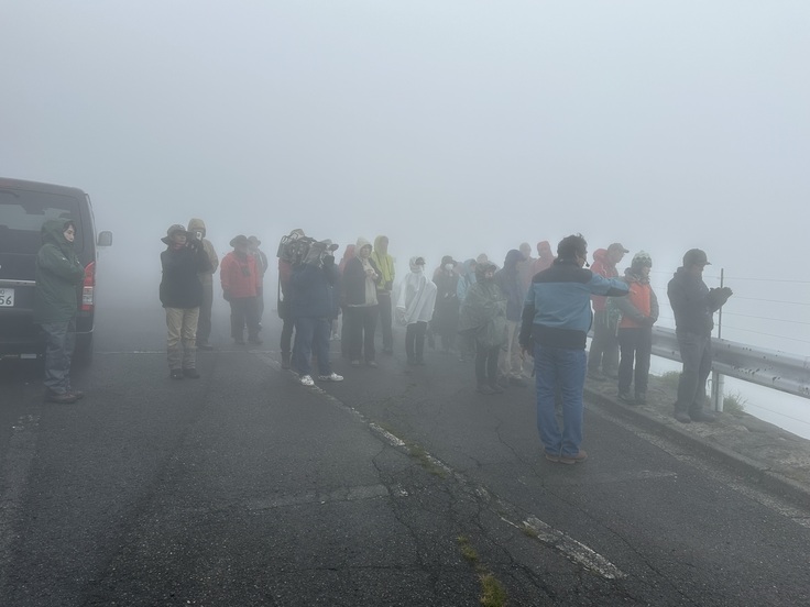 9:45頃、山頂駐車場に到着。まずはトイレに行く人と観察地点に向かう人に分かれて皆がバラバラに出発。トイレの方向と観察地点の方向を伝えたが、20m先が見えない霧の中で全員が観察地点に到着するのかさえ心配になってきた。