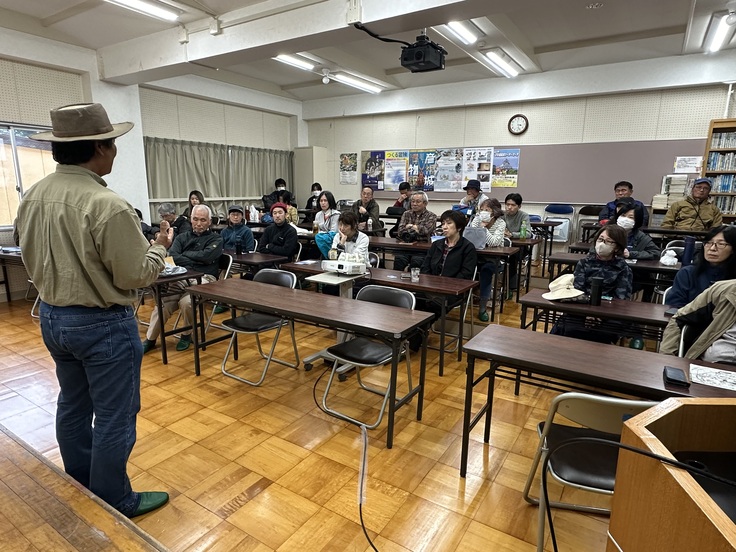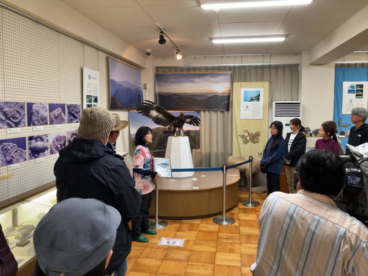 残念ながら霧が晴れることなく正午前に観察を終了。雨足が強まって天候の回復は見込めないと判断して下山。麓にある伊吹山文化資料館でイヌワシ幼鳥の剥製(2019年に巣立ち後半月ほどで落鳥)を見学後、レクチャールームでイヌワシとアフリカの動物の話をしました。