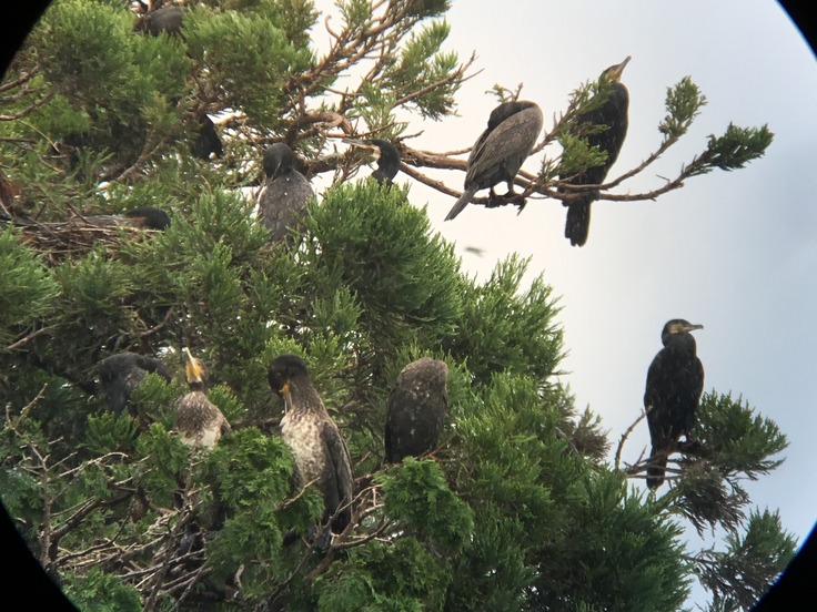 2つ目は彦根城にあるカワウのコロニー、こちらも繁殖は最終段階なのでどれくらいがコロニーに残っているのかわからない。到着してみると、まだまだコロニーは賑やかだ。全体的に巣内の子育ては終わりだが、巣立った幼鳥は巣の近くにいて親鳥が魚を持ち帰るのを待っている。
