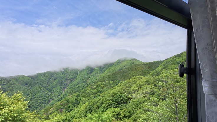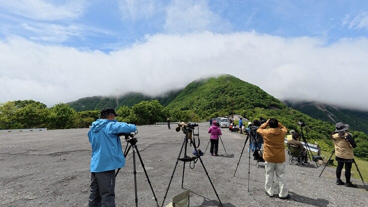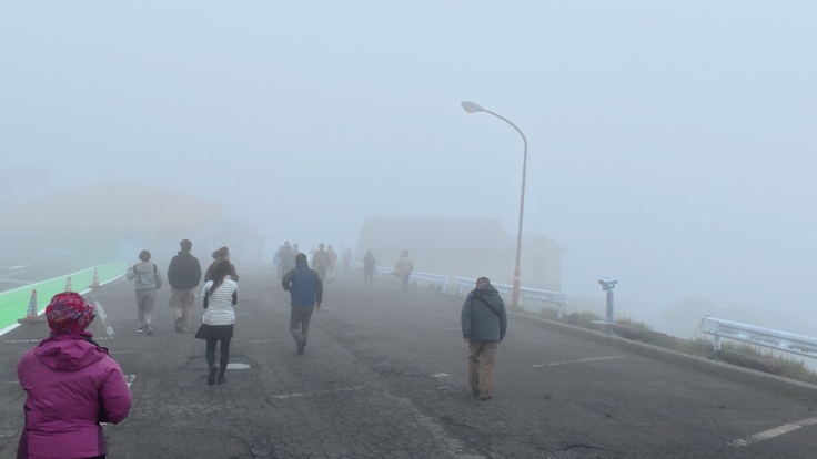 13:20、観察地点を霧より下の5合目付近の駐車場に変更した。霧の中から脱出して気持ちも晴れやかになる。