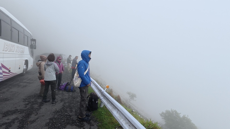 観察地点はまだ霧の中だ。霧と強風の中で晴れるのを待つが霧は上がらない。