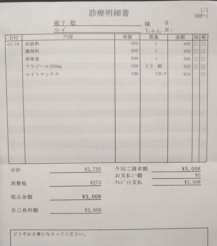 その次の日(3/15)は食欲はあり吐き戻しもなかったものの、おなかはゆるい状態だったので、お世話になっている獣医師さんに相談したところ、FIPやFIPのお薬での症状ではなく、胃腸炎の可能性があるとのことでした。