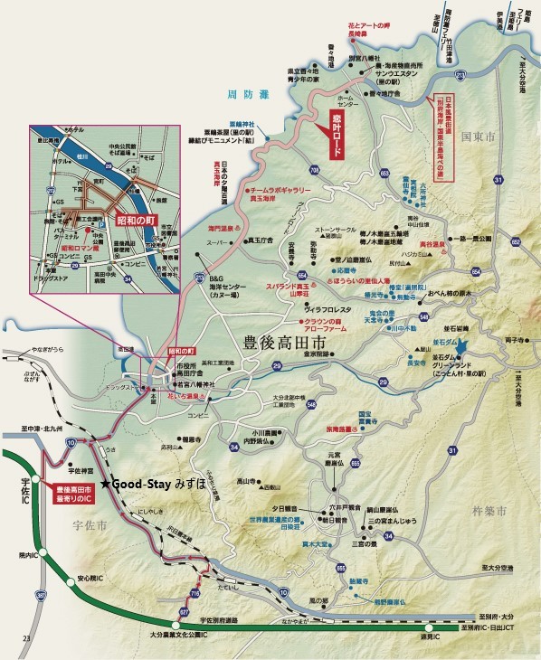 当館は国東半島の付け根に位置し、JR宇佐駅から徒歩圏内で自転車の運搬も徒歩で可能です、回りには海沿いの道路や森林浴ができる山間のツーリングも出来るアスファルトの山道などが多く、楽しめる自然の環境が残る開発遅れがラッキーの地域です。