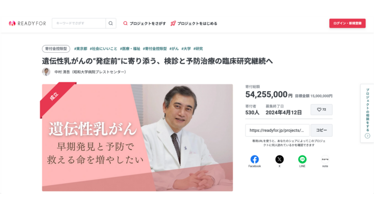 2024年、 私たちはBRCA1 / 2に起因する遺伝性乳がんにスポットを当て、乳がん未発症の方への乳房MRIやリキッドバイオプシー、乳がん関連遺伝子の測定への研究費を募るクラウドファンディングを実施いたしました。その際には500名を超える多くの皆さまより、5,400万円以上のご寄付をいただくことができました。この場もお借りして厚く御礼を申し上げます。