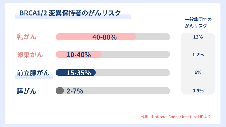 つまり、ご家族に乳がんや卵巣がんの方がいらっしゃる場合、近親者の男性もまた、これらを発症する可能性が高い「BRCA1」または「BRCA2」のバリアントを持ち、通常より高いリスクを抱えている可能性があるのです。