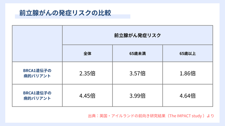 これらのバリアントが確認された男性では、前立腺がんを発症するリスクが高いことがわかってきました。これまで英国を中心に大規模臨床試験が行われており、特にBRCA2の病的変異を有する方では、19~61%の生涯発症確率を有し(BRCA1病的変異陽性者では7~26%)、また、一般的な前立腺がんに比べると10歳以上若く発症し、予後が悪いと言われています(出典:Eur Urol. 2019;76;831–842)。