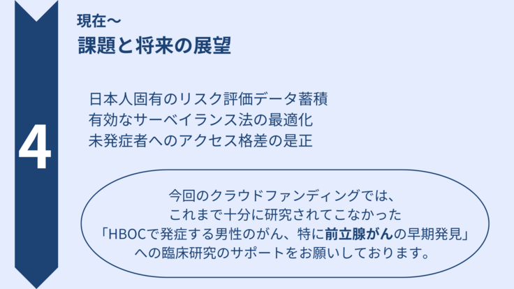 私たち研究チームは、2024年に「遺伝性乳がんの"発症前"に寄り添う、検診と予防治療の臨床研究継続」と題したクラウドファンディングを実施しました。この第一弾のプロジェクトでは、BRCA遺伝子にバリアントを持つ女性のがん未発症者を対象とした研究が行われ、多くの方々のご支援により目標を大幅に上回る成果を収めました。現在、女性のがん未発症者における乳房MRI検診の保険適用化を目指し、タモキシフェンによる予防効果の検証が行われています。その成果により、遺伝性乳がんに対する社会の理解と支援体制が大きく前進することを目指しています。