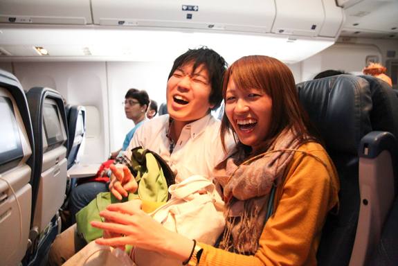 飛行機内で盛り上がる私とあやさん(チーム徳島)。